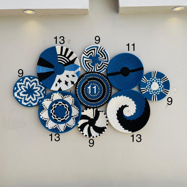 Blue Black & White Boho Wall Basket Set of 9 - Woven African Wall Baskets - Hanging Wall Basket Decor - Basket Wall Art, Bohemian wall Decor