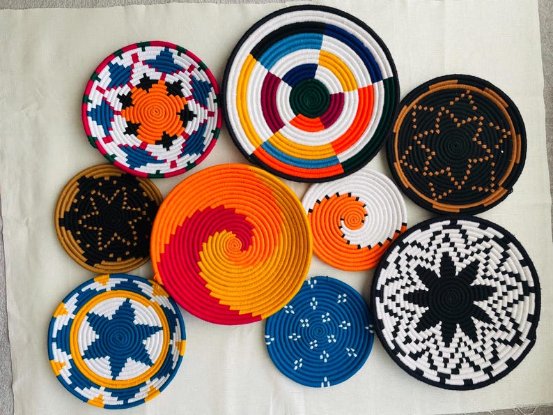 Colourful handwoven wall basket set of 9, boho wall hanging baskets, African wall baskets, basket wall art, bohemian wall decor