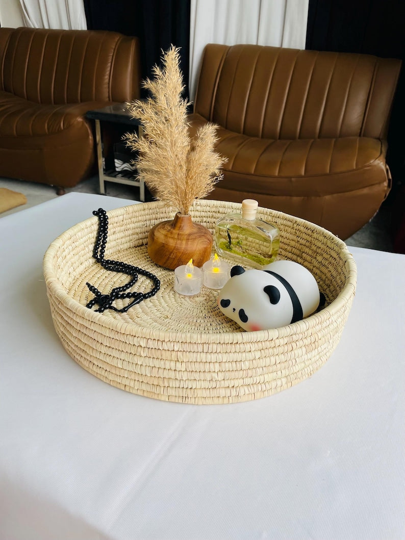 This rustic woven tray for coffee table is made from date palm fiber gathered from the various palm plantations that surround the artisans' village.